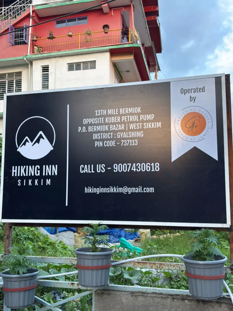 Hiking Inn is located at 13th Mile, Bermiok, opposite Kuber Petrol Pump, near Post Office Bermiok Bazar, West Sikkim District, Gyalshing – 737113.